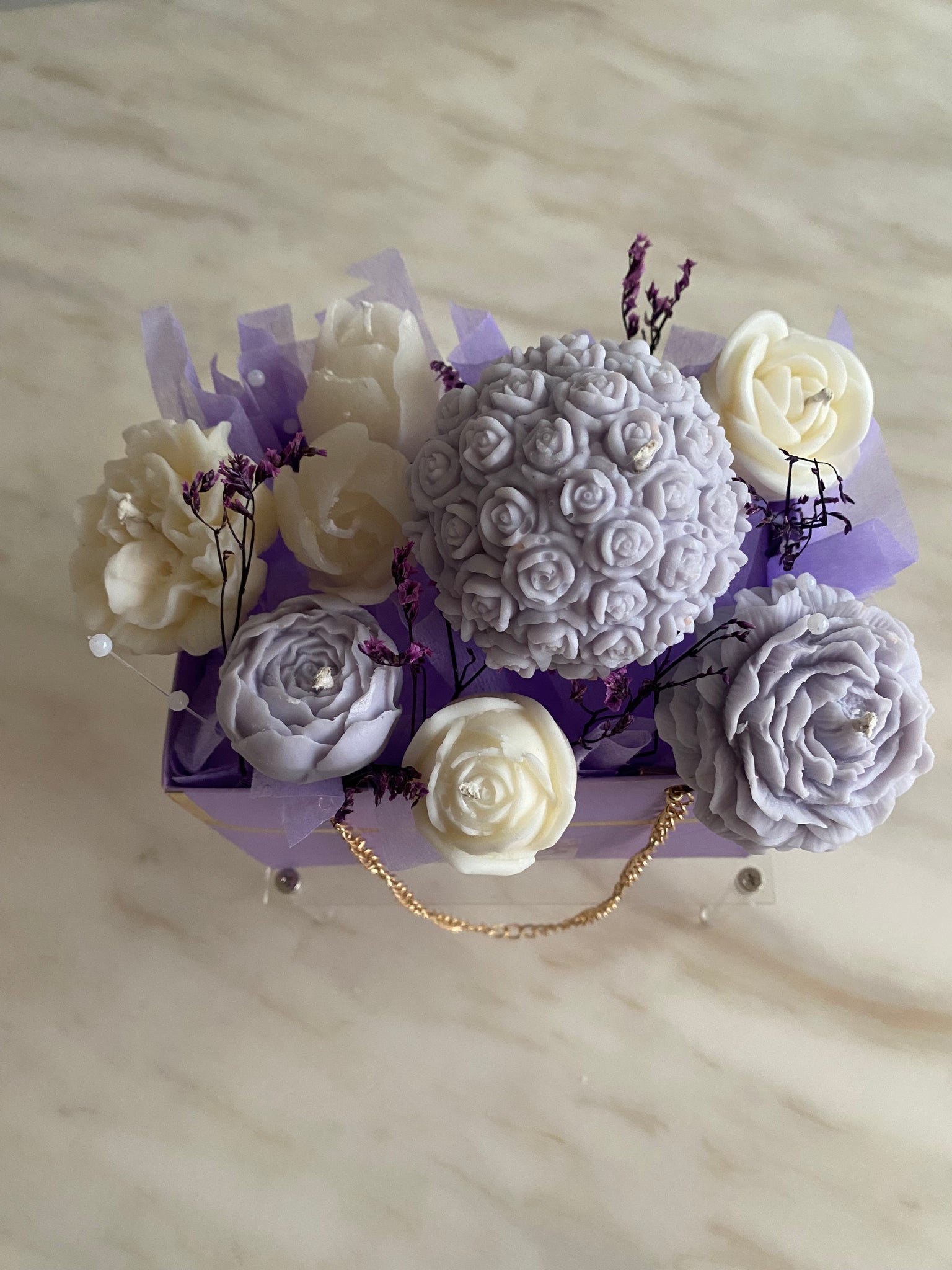 Inspired by the tranquil beauty and timeless elegance of the amethyst gemstone, the Amethyst Candle & Wax Melt Bouquet is a handcrafted luxury arrangement designed to bring a sense of calm, grace, and sophistication. Presented in a soft lavender keepsake box with gold detailing and chain accents, this bouquet features sculpted wax candle flowers and wax melts, delicately arranged with subtle botanical touches for an elevated, refined finish.