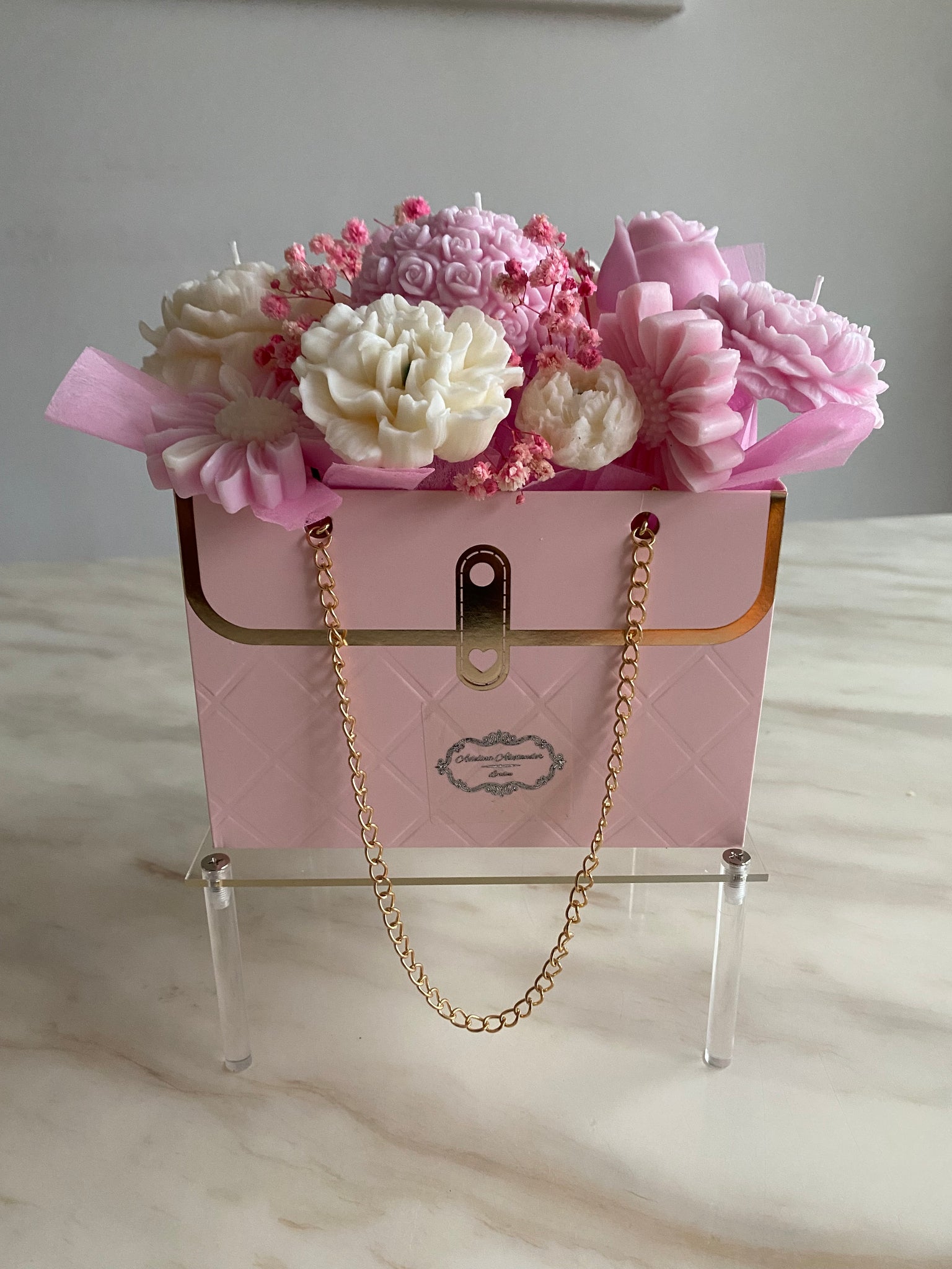 Inspired by the gentle beauty and symbolic elegance of the rose quartz gemstone, the Rose Quartz Candle & Wax Melt Bouquet is a handcrafted luxury arrangement designed to embody love, warmth, and timeless femininity. Presented in an elegant blush-pink keepsake box with gold detailing and chain accents, this bouquet combines sculpted wax candle flowers and wax melts with delicate botanical touches to create a beautifully refined display.
