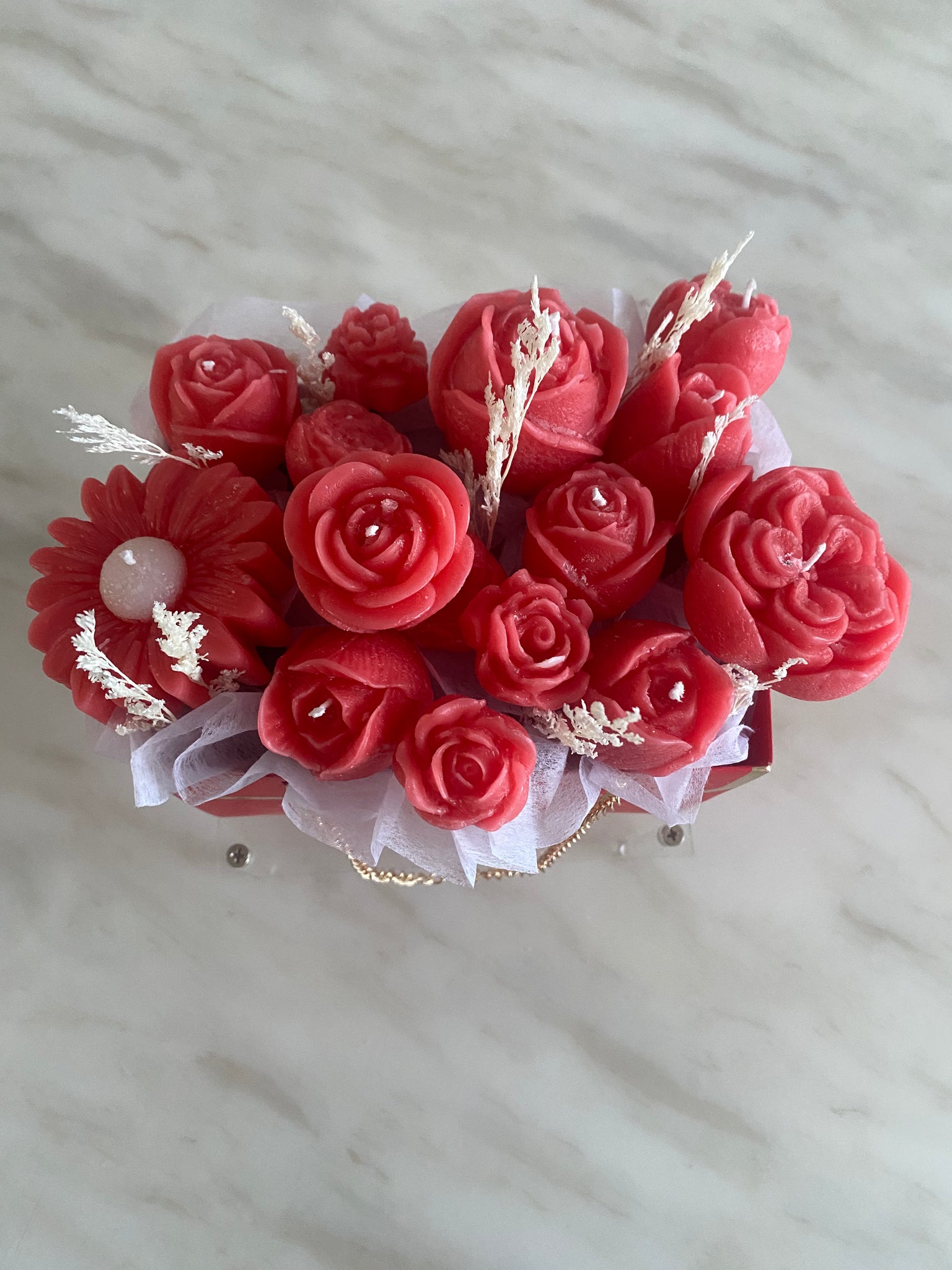 Inspired by the richness and passion of the ruby gemstone, the Ruby Candle & Wax Melt Bouquet is a striking handcrafted statement piece designed to symbolise love, confidence, and luxury. Presented in an elegant red keepsake box with gold detailing and chain accents, this bouquet blends sculpted wax florals with decorative botanical touches to create a show-stopping display.