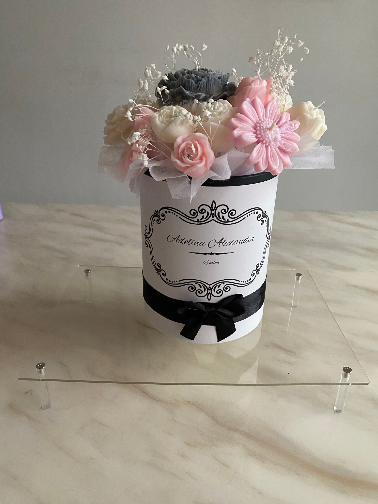 Inspired by the luminous beauty of the moonstone gem, the Moonstone Candle & Wax Melt Bouquet is a handcrafted statement piece designed to reflect individuality and refined luxury. Presented in our signature Adelina Alexander keepsake box, each bouquet is carefully arranged with sculpted wax candle flowers and wax melt florals, finished with delicate botanical accents to create a timeless and elegant display.